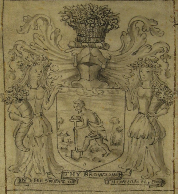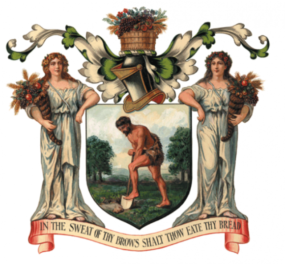 The central shield shows Adam delving in the ground with a spade and the motto below is a quotation from the section of Genesis where the Lord banishes Adam and Eve from the Garden of Eden. The female figures, known in heraldry as Supporters, are holding cornucopias of fruit and flowers, appropriate of course to the gardener's trade.
