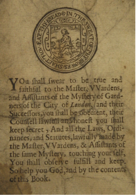 Here the Gardeners' seal, depicting on the central shield another version of Adam vigorously digging, is affixed to a copy of the oath taken by a Freeman on admission to the Company. It dates from about 1650 and, coming from the Commonwealth period, notably excludes a promise of loyalty to the Crown.